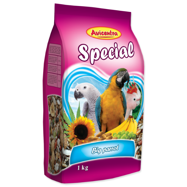 Vyvážené krmivo pro velké papoušky, vhodné pro dlouhodové krmení.