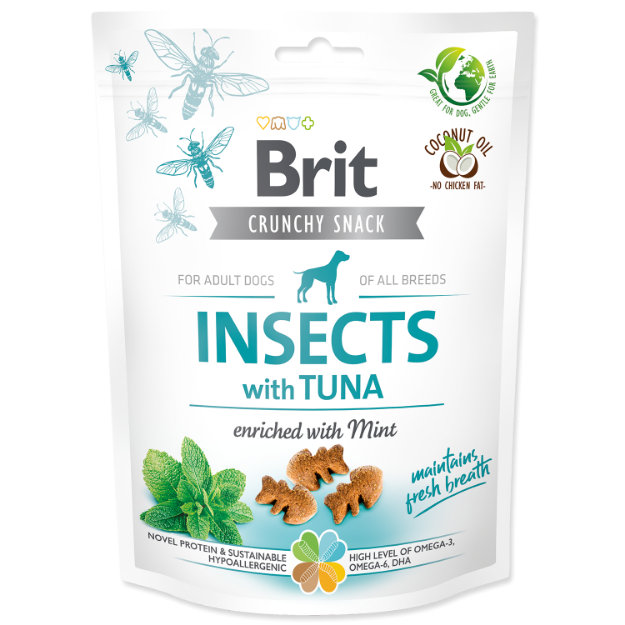Složení: hmyzí protein (26 %), hrášek, tuňákový protein (14 %), bramborový škrob, kokosový olej, lněné semínko (4 %), sušená jablečná dužina, hydrolyzovaná kuřecí játra, sušená máta (1 %), sušená řasa (1 %, Schizochytrium limacinum), řepkový olej.