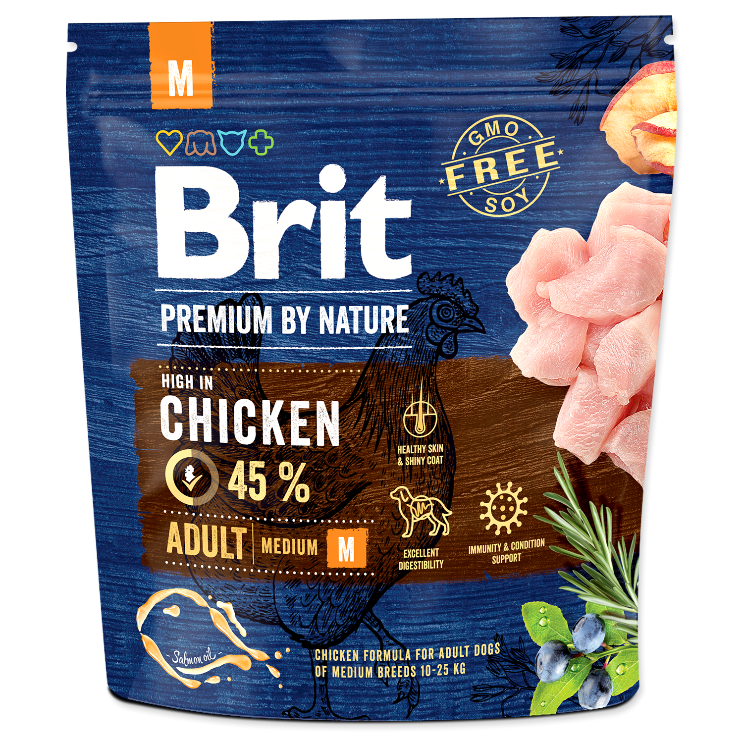Kompletní prémiové krmivo s kuřecím masem pro dospělé psy středně velkých plemen.