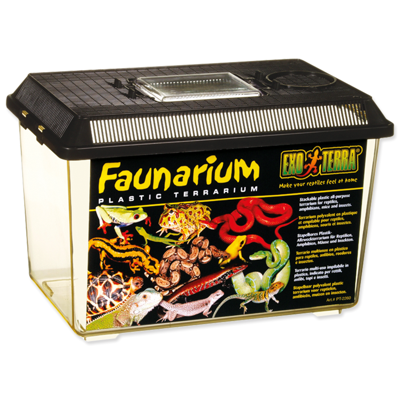 Přenosný průhledný plastový box pro terarijní zvířata.