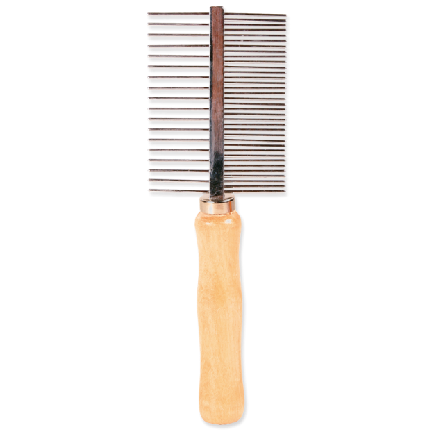 Kovový, oboustranný hřeben s dřevěnou rukojetí.