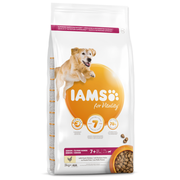 Krmivo IAMS for Vitality pro psí seniory velkých plemen je 100% kompletní a vyvážené, odborníky sestavené krmivo, které bude vašemu zvířeti chutnat a svědčit. Naše nová a vylepšená receptura pro psí seniory s čerstvým kuřecím masem je založena na pečlivě vybraných, kvalitních živočišných bílkovinách, které podporují sedm znaků zdravé vitality psa. Aby byl váš pes zdravý, aktivní a plný energie, obsahují naše lahodné receptury až 78 % živočišných bílkovin (z celkového obsahu bílkovin). Umožněte svému mazlíčkovi užívat si každý den naplno!