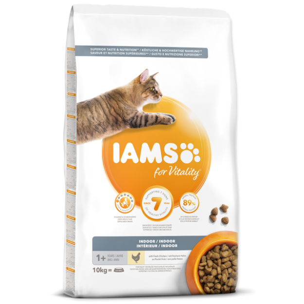 Krmivo IAMS for Vitality pro dospělé kočky a kočičí seniory žijící v bytě je 100% kompletní a vyvážené, odborníky sestavené krmivo, které bude vašemu zvířeti chutnat a svědčit. Naše nová a vylepšená receptura s čerstvým kuřecím masem je založena na kvalitních živočišných bílkovinách pečlivě vybraných tak, aby podporovaly sedm znaků zdravé vitality kočky. Aby byly kočky zdravé, aktivní a plné energie, obsahují naše lahodné receptury až 89 % živočišných bílkovin (z celkového obsahu bílkovin). Naše receptura pro kočky chované v bytě dokonale přispívá k zachování štíhlé a zdravé tělesné stavby.
