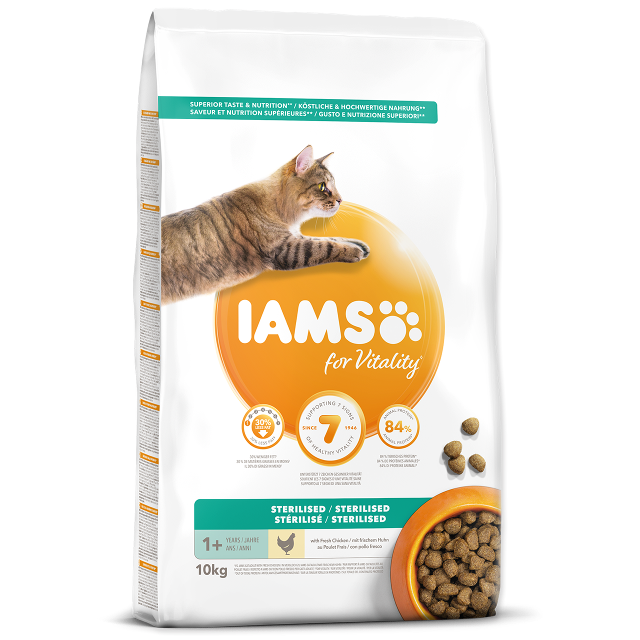 Krmivo IAMS for Vitality pro kastrované dospělé kočky a kočičí seniory je 100% kompletní a vyvážené odborníky sestavené krmivo, které bude vašemu zvířeti chutnat a svědčit. Naše nová a vylepšená receptura s čerstvým kuřecím masem je založena na kvalitních živočišných bílkovinách, které byly pečlivě vybrány, aby podporovaly sedm znaků zdravé vitality kočky. Aby byly kočky zdravé, aktivní a plné energie, obsahují naše lahodné receptury až 84 % živočišných bílkovin (z celkového obsahu bílkovin). Naše receptura pro kastrované kočky skvěle pomáhá regulovat hmotnost.