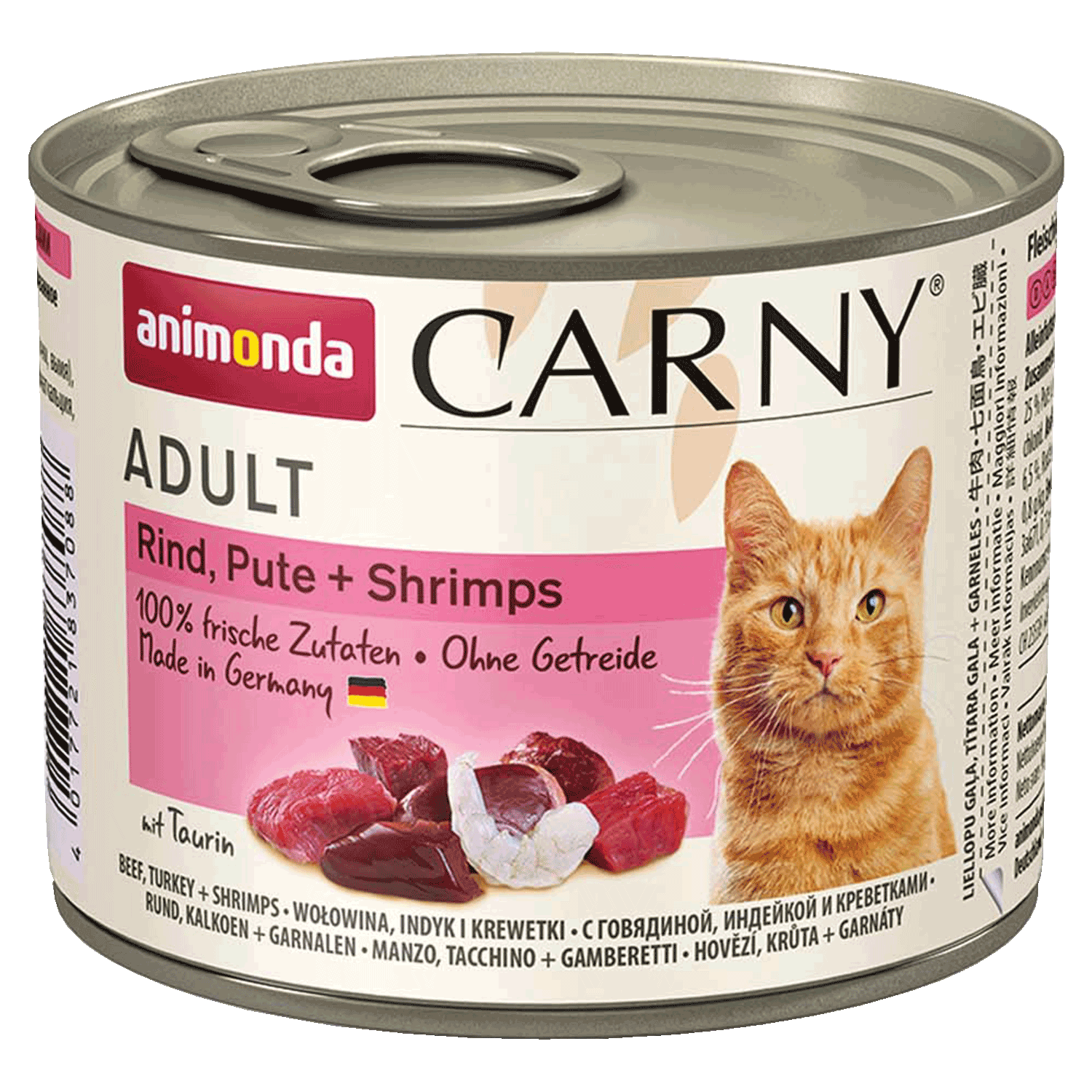 - žádné obiloviny, sója nebo cukr - žádná umělá barviva ani konzervační látky - s taurinem - pro kočky od 1 do 6 let Carny Adult Beef, Krůtí + Krevety: lahodné, masité a čerstvé krmivo pro kočky Čerstvá a masitá dobrota: Carny Adult Beef, Turkey + Shrimps zaručuje druhově vhodnou výživu pro kočky v celé své kráse. S obsahem masitých ingrediencí 65 % je toto šťavnaté krmivo z hovězího, krůtího masa a krevet čistým potěšením pro každou kočku. Carny Adult Beef, Turkey + Shrimps poskytuje dospělým kočkám od 1 do 6 let všechny základní živiny, které potřebují. Rychlé a šetrné zpracování zachovává vitamíny a živiny. Carny Adult Beef, Turkey + Shrimps neobsahuje žádné obiloviny, sóju ani cukr. Kolik by měla kočka sníst za den? Jaké je správné množství jídla? Správné množství krmiva lze vypočítat na základě věku, hmotnosti a úrovně aktivity kočky. Následující doporučení ohledně krmení lze použít jako obecné vodítko: kočce o hmotnosti 3 kg by mělo být podáváno 175 g krmiva pro kočky denně. kočka vážící 4 kg by měla dostat 200 g kočce, která váží 5 kg, může být podáváno 245 g denně Carny – Masové čerstvé, tak, jak to kočky milují! Lahodná, zdravá a vyvážená výživa pro kočky v celé své kráse! Carny® Adult je značka krmiva pro dospělé kočky ve věku od 1 do 6 let, které si vychutnají jedinečnou chuť s čerstvými masovými přísadami. Carny® Adult navíc poskytuje dospělým kočkám všechny základní živiny, které potřebují. Složení 36 % hovězí maso (plíce, srdce, maso, ledviny, vemeno), 25 % krůtí maso (játra, srdce), 4 % krevety, uhličitan vápenatý, chlorid sodný. Jakostní znaky Protein 11,5 %, obsah tuku 6,5 %, hrubá vláknina 0,5 %, hrubý popel 1,8 %, vlhkost 79 %, taurin 0,8 g/kg