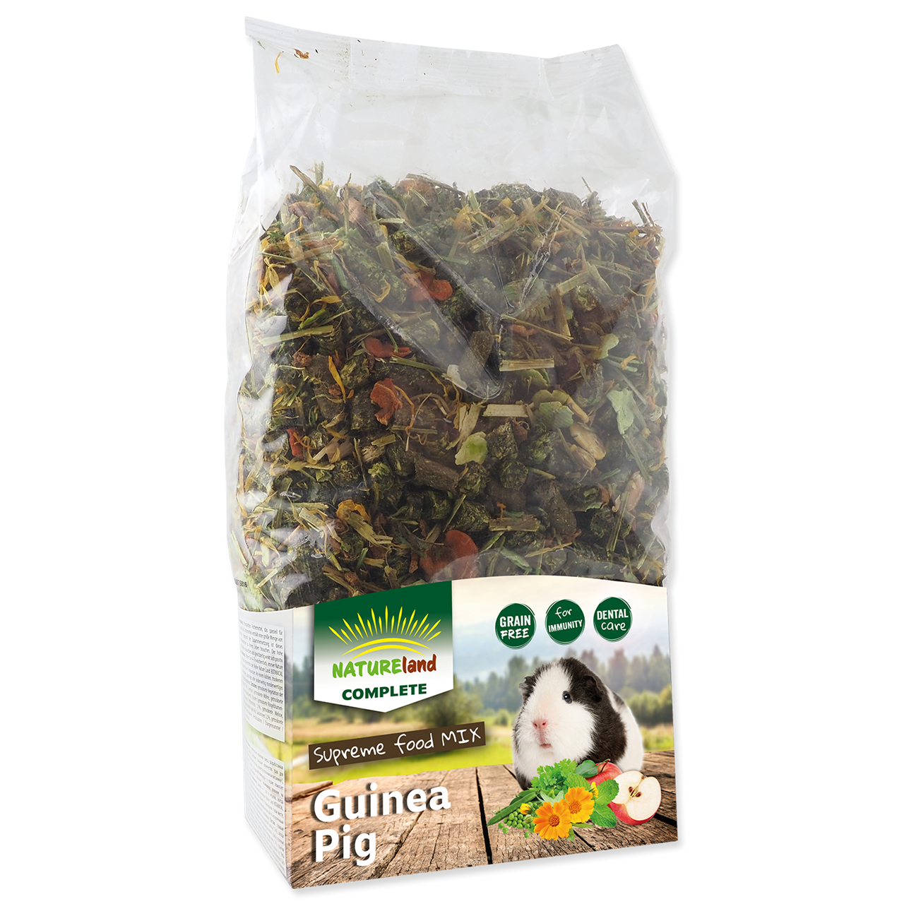 Bezobilné krmivo, které je vyvinuto speciálně pro výživové potřeby morčat. Toto krmivo neobsahuje žádná přidaná barviva. Díky pečlivě vybraným druhům bylin a zeleniny obsahuje vysoký podíl vitamínu C, který je pro morčata nezbytný. Vysoce kvalitní seno z podhůří alp ve spojení se speciálními bylinami a prebiotiky podporují správnou funkci zažívání. Vyvážené složení tohoto krmiva dodá vašemu morčeti veškeré živiny a minerální látky pro udržení správné funkce organismu. Chutnost tohoto krmiva je podpořena přídavkem sušených květů alpských bylin.
