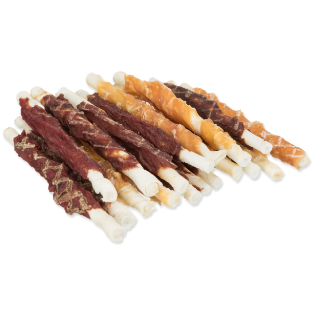 Tyčinky z hovězí kůže obalené kuřecím, jehněčím a hovězím masem.