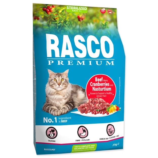 Složení: sušené hovězí maso (30%), rýže (14%), kukuřice (11%), hovězí škvarky (5%), kuřecí tuk (5%), hydrolyzovaný živočišný protein, vývar, lososový olej (2%), vláknina z řepných řízků, lněné semínko (1%), pivovarské kvasnice (0,8%), výtažek z brusinek a lichořeřišnice (0,7%), sušená mrkev (0,5%), sušený yucca (0,2%), psyllium (0,2%), taurin (0,1%), extrakt z rozmarýnu (20mg/kg), extrakt tocoferolu z rostlinného oleje, extrakt z aloe vera, kyselina citronová, kyselina askorbová, vitamíny a minerály.