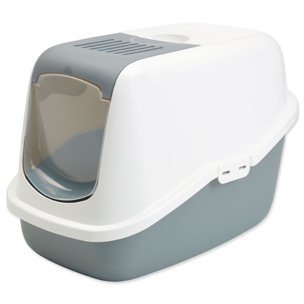 Toaleta pro kočky s plastovým krytem, dvířky a filtrem.