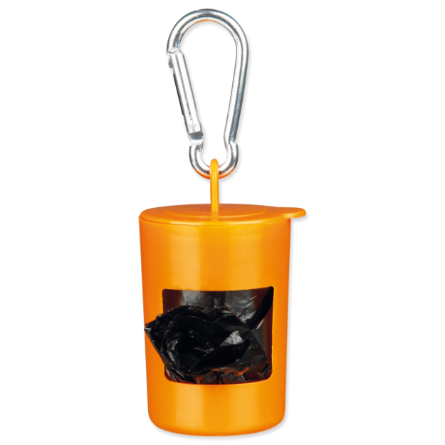 Plastový zásobník s karabinkou na igelitové sáčky a 2 role sáčků po 20 ks.